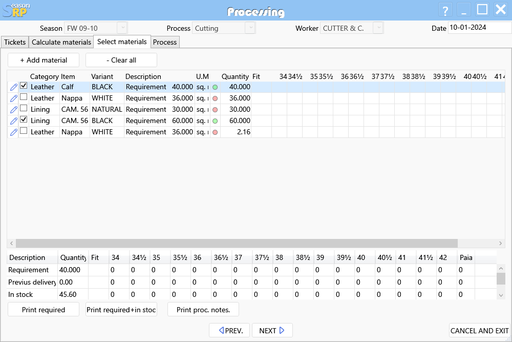The second step of the wizard, calculate all the materials needed for the process keeping track of the materials already delivered to the manufacturer, for instance if the manufacturer already received 100 pairs of some material now it will be prompted to give him the quantity needed minus 100.
